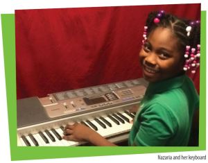 One of our newest and most enthusiastic piano students is Nazaria, who is in the second grade at Emerald Academy. She started taking lessons with volunteer teacher Ashley Williams this fall after spending forever on our waiting list. Well, it wasn’t actually forever. It was only about six months. But that sure seems like forever when you are 7 years old and want to start learning piano SO BAD. Nazaria’s mom, NyKeesha, did a great job of managing our application process. NyKeesha first reached out to us when Nazaria was just 5 years old. We told her the earliest a student can start oneon- one lessons is 7. So NyKeesha waited patiently and when Nazaria turned 7, her mom applied for lessons. We put her on the waiting list last April.
