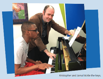 Most of the music performed at our spring recital was familiar to anyone with a passing knowledge of the classics. But there was one piece nobody in the audience had heard before. Called “Spring Sunrise,” it was written by JoMS volunteer teacher KristopherRucinski and played by his piano student Jamal. Kristopher has written a handful of pieces for his students over the years. “It’s been my experience as a performer that there’s a special feeling of achievement at being the first person to play a work,” he says. “Also, I like to involve them in the compositional process. Writing a piece that plays to their skills gives them something they can’t get in a book.”Kristopher describes Jamal as “a very expressive player.”Together they’ve had some improvisation sessions where Jamal has shown “a very adventurous sense of choosing chords and rhythm. I wanted to incorporate that in my piece. It wasn’t all in 4/4 time. There was 7/8and 6/8 and all kinds of things.”“Spring Sunrise” is a beautiful piece that unfolds slowly with some repeating elements and pauses. It’s meant to sound like emerging from the cold of winter into a beautiful landscape, Kristopher explains. Jamal is one of three piano students Kristopher is teaching at the Joy of Music School. The others, Elsie and Gianna, will “absolutely” get to debut original compositions by him in the near future. “In fact, Giannahas already asked me for one!” he says. We can’t wait to hear it.